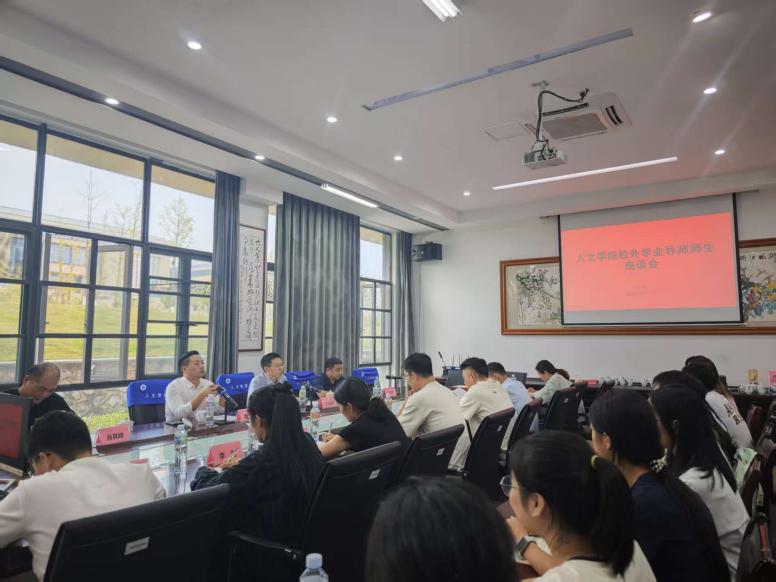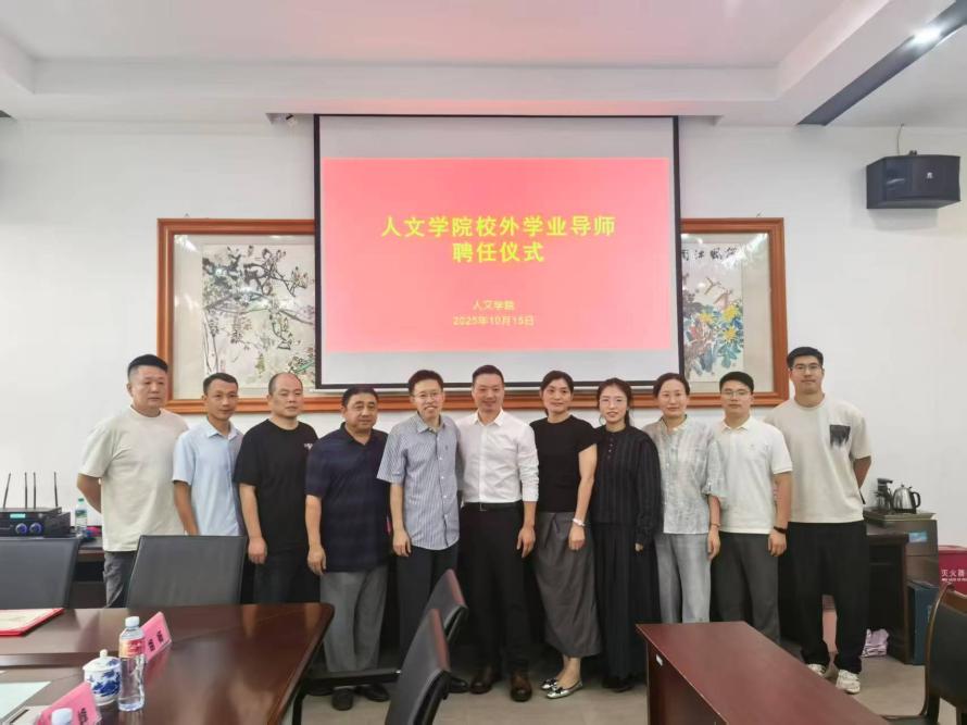 (本网讯:文|图洪晓晓)为进一步整合优质社会资源,搭建校企协同育人平台,助力学生成长成才,10月15日,人文学院在人文学院105会议室隆重举行校外学业导师聘任仪式,并紧接着举办了校外学业导师师生座谈会。来自“景漂”党委的4位党员企业家受聘为人文学院校外学业导师,学院领导班子成员、相关专业教师代表及20余名学生参加了此次活动。