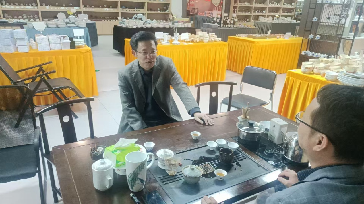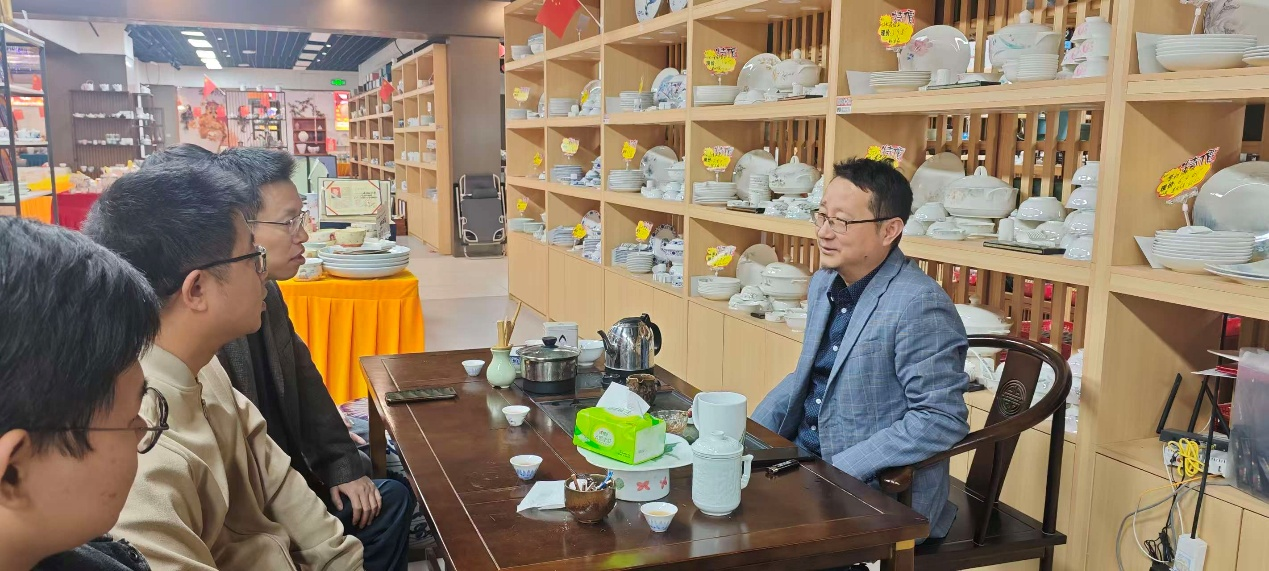 交流过程中,江旺龙详细介绍了人文学院的专业布局与人才培养特色,强调学院始终以学子就业为导向,希望通过校企协同发力,为青年学子搭建从校园到职场的“绿色通道”,让更多具备文化素养的人才扎根陶瓷产业。在徐罗迪老师的陪同下,两名学子代表现场展示了专业所学与实践能力,围绕职业发展愿景与企业需求展开互动,其扎实的专业功底与积极的态度获得认可。