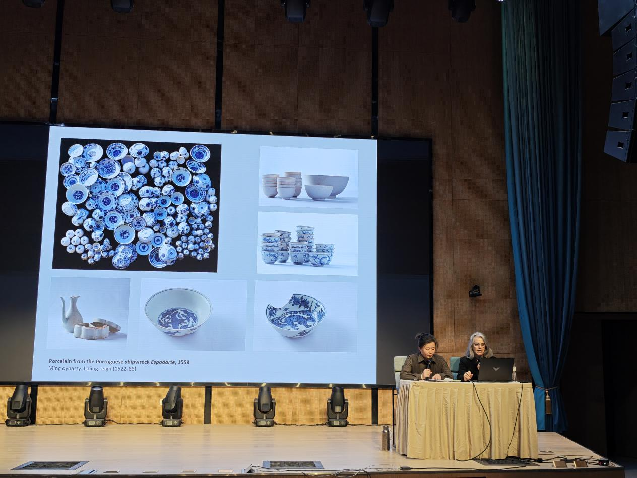 讲座中,Teresa Canepa(甘淑美)结合文献记载、实物遗存与图像资料,系统梳理了16-17世纪销往欧美市场的中国瓷器类型,深入探讨了这些瓷器在不同文化背景下的流通路径、鉴赏方式与实际使用情况。她指出,这一时期中国瓷器不仅是贸易商品,更是文化交融的载体,影响了欧洲的审美趣味与生活方式。在讲座互动环节,黄薇通过猜器物的用途、猜器物纹饰所代表的含义等提问让讲座增添了些许趣味性。讲座结束后,陈猛与Teresa Canepa(甘淑美)提问交流。