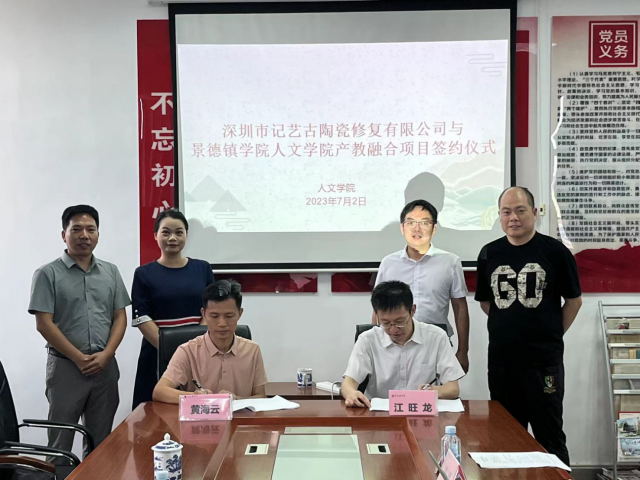 (本网讯:文|图张璊)7月2日下午,我院与深圳市记艺古陶瓷修复有限公司产教融合项目座谈会暨签约仪式在本院举行,书记江旺龙、院长陈猛出席仪式。副院长肖其峰、文博系主任李伟信参加座谈和签约仪式。