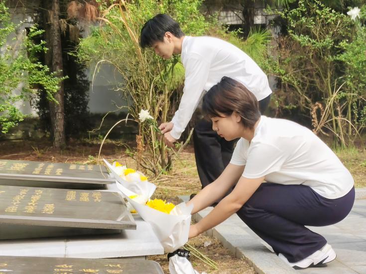 活动现场庄严肃穆,全体人员整齐肃立。学生代表钟国轩登台,言辞铿锵,忆烈士事迹,抒青年追思,表传承红色精神、勇担时代使命之决心。发言毕,全场静默一分钟,以无声缅怀致敬舍生忘死的烈士。默哀结束后,众人在纪念碑前献上鲜花。最后,全体人员依庄严指令整齐列队,向烈士行三鞠躬礼。