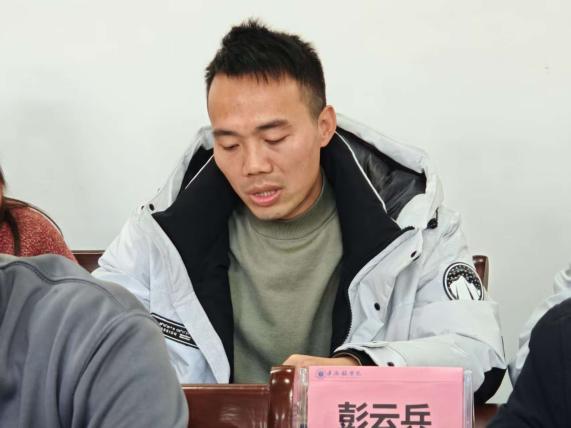 彭云兵老师在会上作交流发言。他谈到要树立正确政绩观,必须坚持从实际出发、按规律办事,要力戒形式主义,坚决杜绝口号式、表态式的做法,要以钉钉子精神担当尽责,稳扎稳打向前走