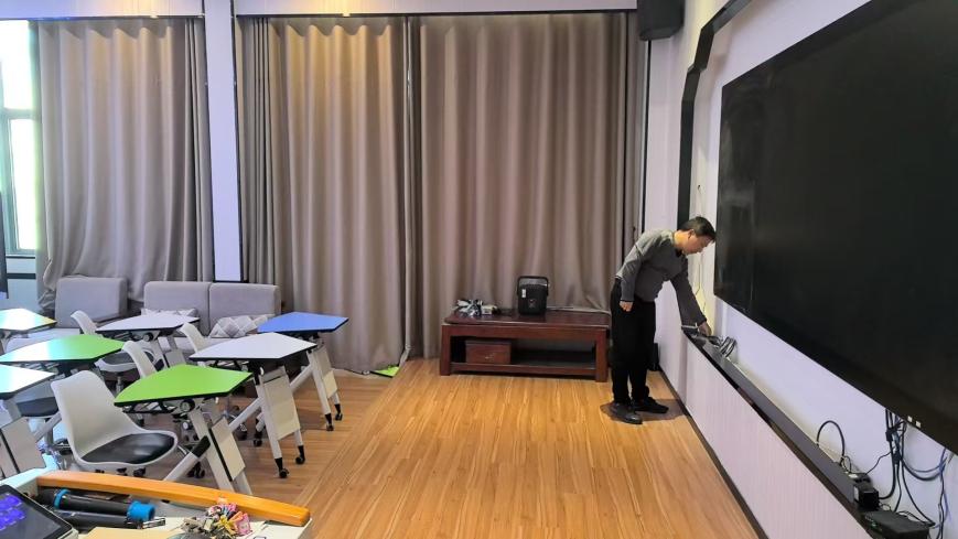 检修过程中,工作人员全程协同配合,协助技术人员现场排查、立行立改,确保每一间教室设备均具备正常使用。工作人员同步完成智慧教室操作台电池等耗材的更新与补充。