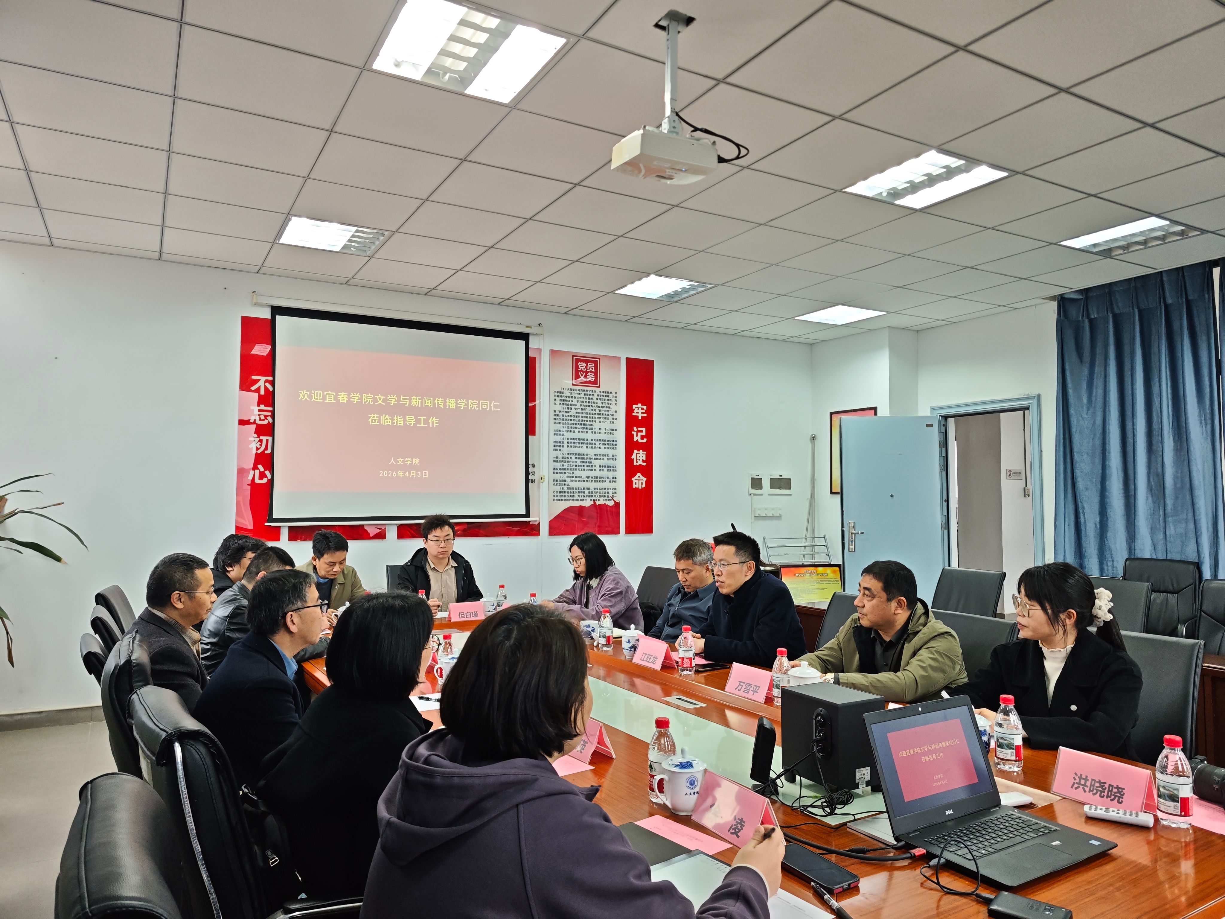 (本网讯:文|易丽婷图|洪晓晓)4月3日上午,宜春学院文学与新闻传播学院院长高建青、副院长魏军、副院长尹瑛等一行8人莅临人文学院,开展考察交流活动。双方围绕数字人文专业建设、学科特色发展等核心议题展开深入研讨。此次交流会议由人文学院党委书记江旺龙主持,副书记万雪平、副院长李伟信、数字人文教研室主任易丽婷、普通话测试站主任高瑾瑜及数字人文专业教师代表出席会议。